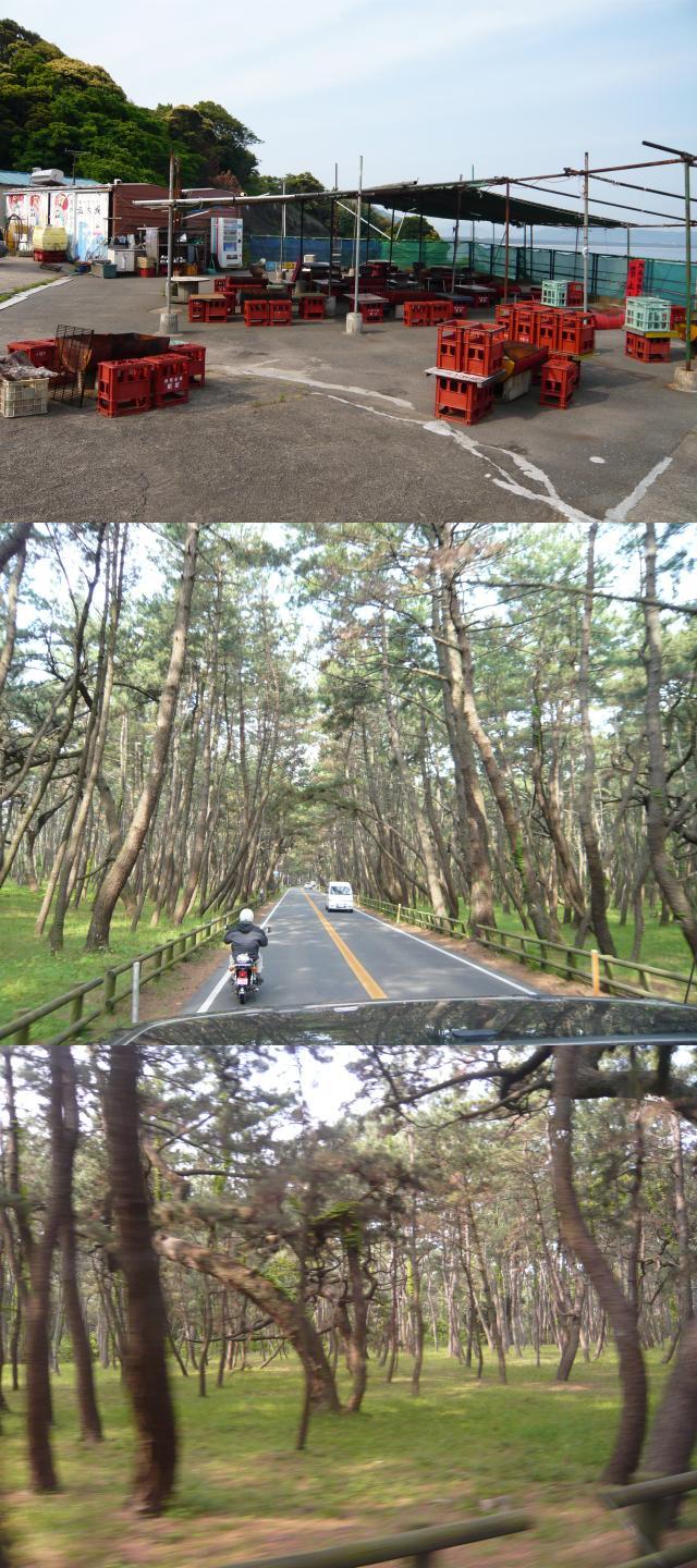 途中、去年の海鮮バーベキューを行った塩木城(写真左上)にて記念撮影をしたり、虹の松原を車でドライブ(写真左中下)しつつ到着したは呼子の朝市(写真中央上)去年はここでイカ丸君に乗って七ツ釜まで行ったんですよね~♪等と思い出に浸っていると2本目のビールの配給f(^^;)