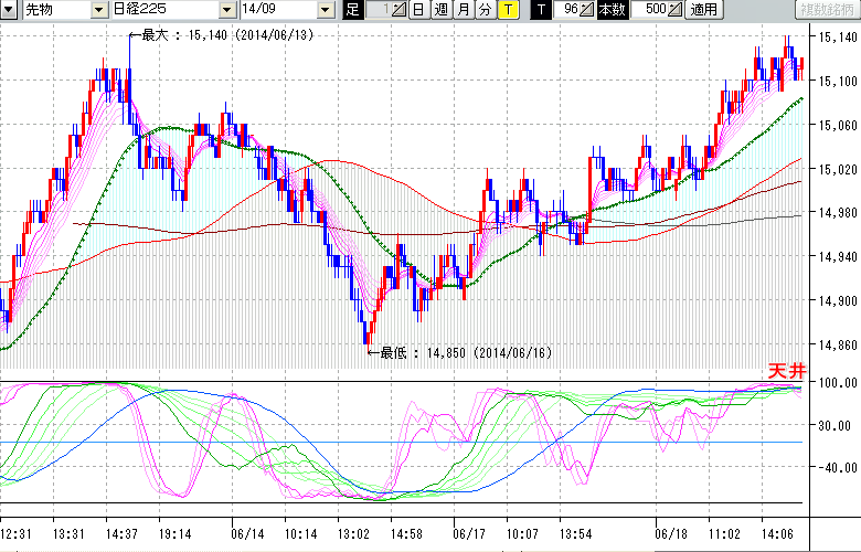 指標ラインの密集点が天底・転換点を示します。指標の見方