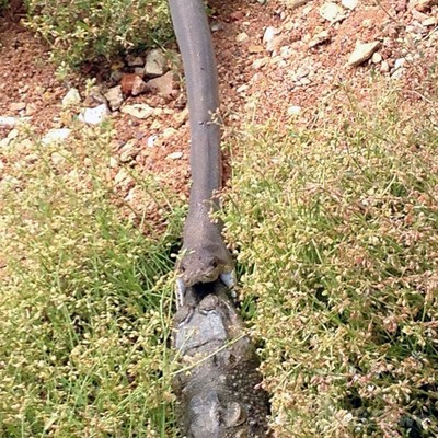 ▲ キャプション表示 ×豪・クイーンズランド(Queensland)州にある鉱山の町、マウントアイザ(Mount Isa)近くのムーンダラ湖(Lake Moondarra)で、ワニを丸のみしようとするヘビ(2014年3月3日撮影、)。(c)AFP/TRAVIS CORLIS/TNT CORLIS
