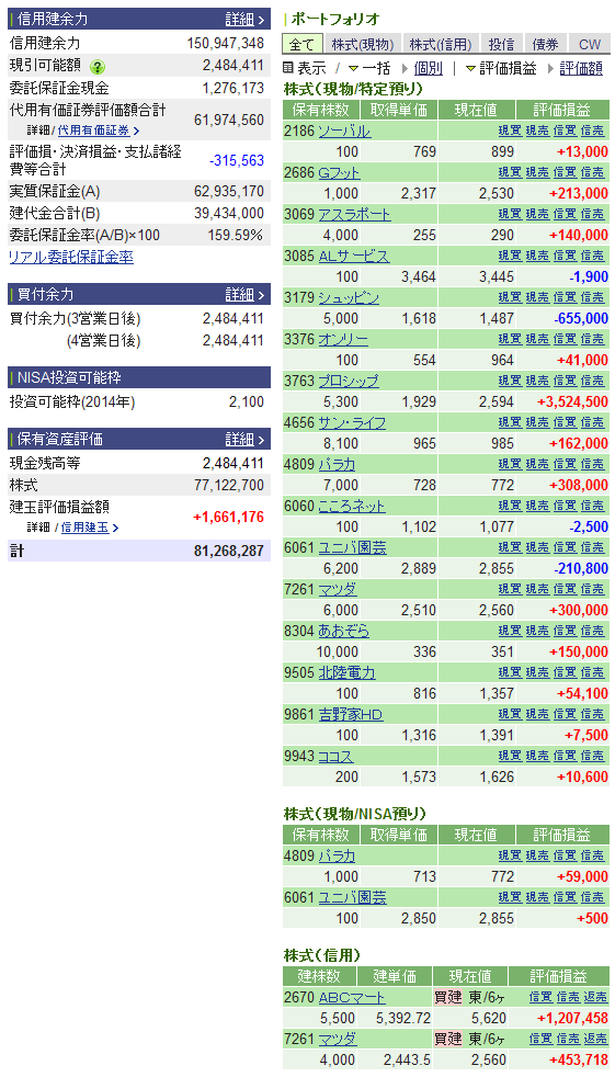 そのあと下がった所で,信用で2万株追加して,昨日の上昇でようやく現物分も