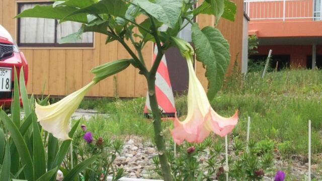 エンジェルトランペット、実家のは基本的にほったらかしですが黄色のが毎年咲いています。 好きな花なんですが、暑いのがニガテじゃ、今の我が家では無理かな~