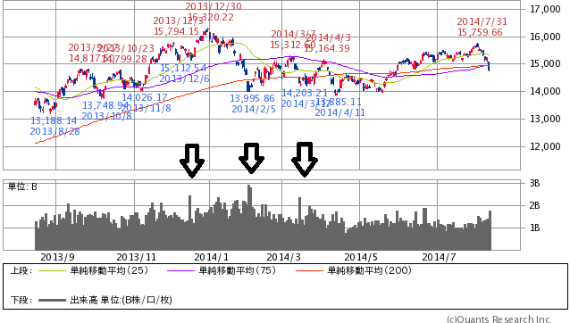 ③上昇が一時的で下げとなった場合は、底を判断するのに、出来高が大きく増えているかどうかに着目。
