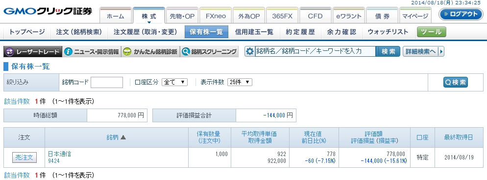 保有株状況@GMOクリック証券:含み損益-144,000円