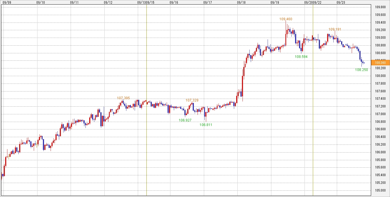 海外市場は、1ドル=108.70~109.10円台で全体としては右肩下がりの値動きでした。欧州市場では、109円台の高値圏でのモミ合いに終始しました。