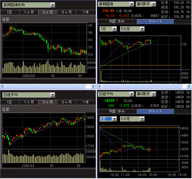 売り残が減って、裁定買い残も減って、仮需がすっきりしてきた感じです。欧州系証券の先物建玉も、3月頃と比べるとショートポジがだいぶ買い戻されたようで(今日は売ってますが)、需給の偏りによる上昇/下降圧力はかなり小さくなっているんじゃないかと思います。