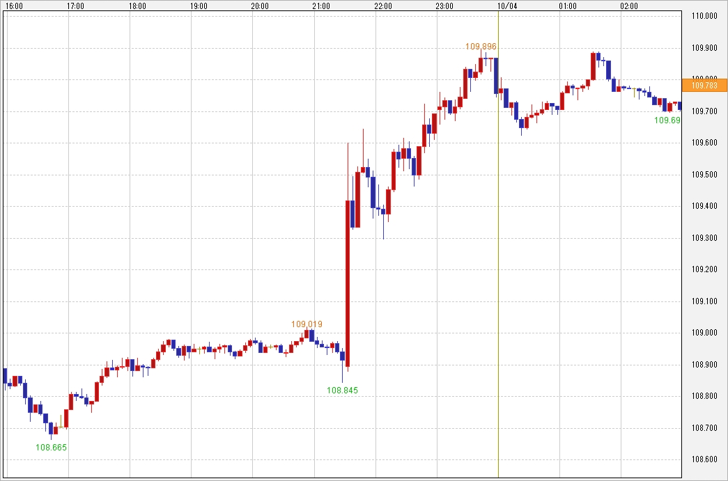 発表時のドル・円チャート。一段高で109円台に突入したが伸びきれず。