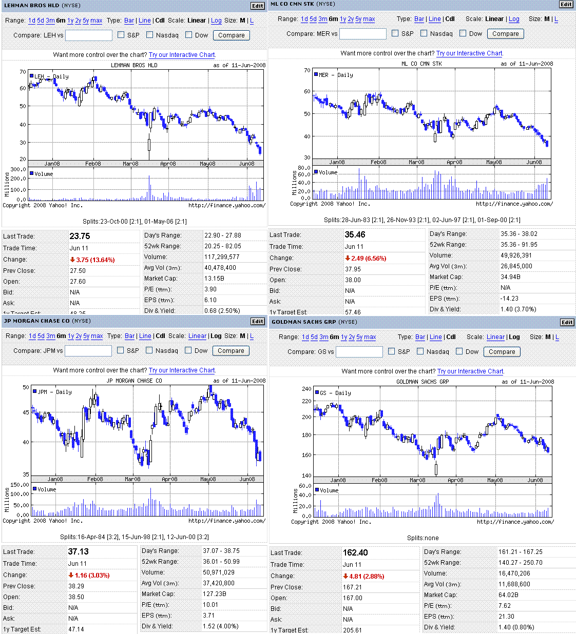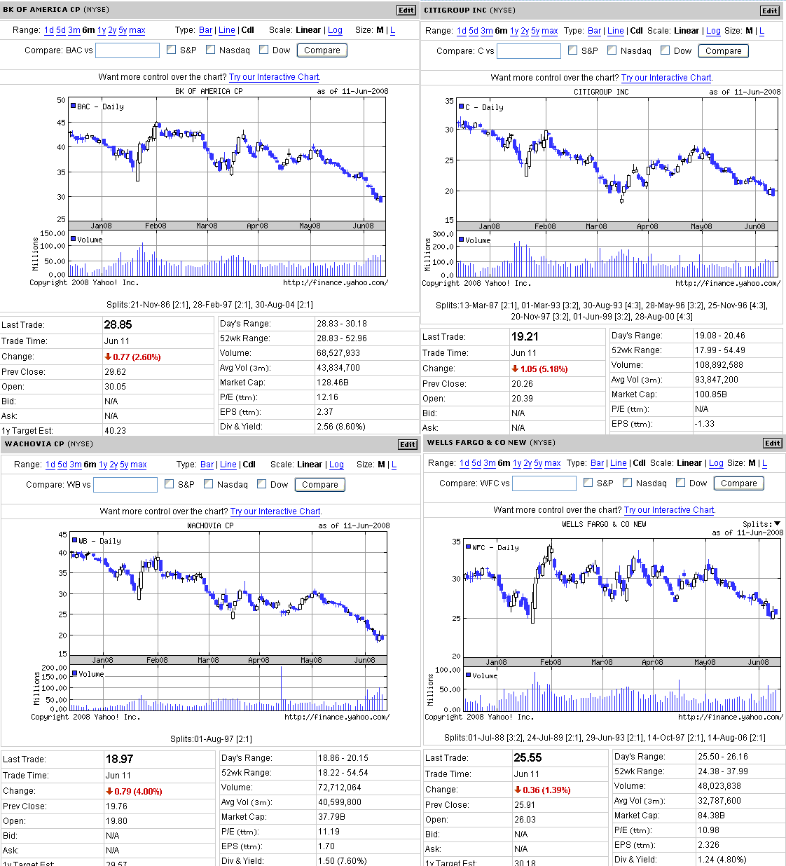 原油価格が反発したことや、金融株が引き続き売られたこと、ベージュブックが冴えない内容だったことから、米株は大幅下落となりました。画像1に投資銀行、画像2に商業銀行のチャートをまとめてみましたが、まあひどい有様で・・・。今後しばらくは、米株価指数は、金融セクターの動き次第でしょうね。