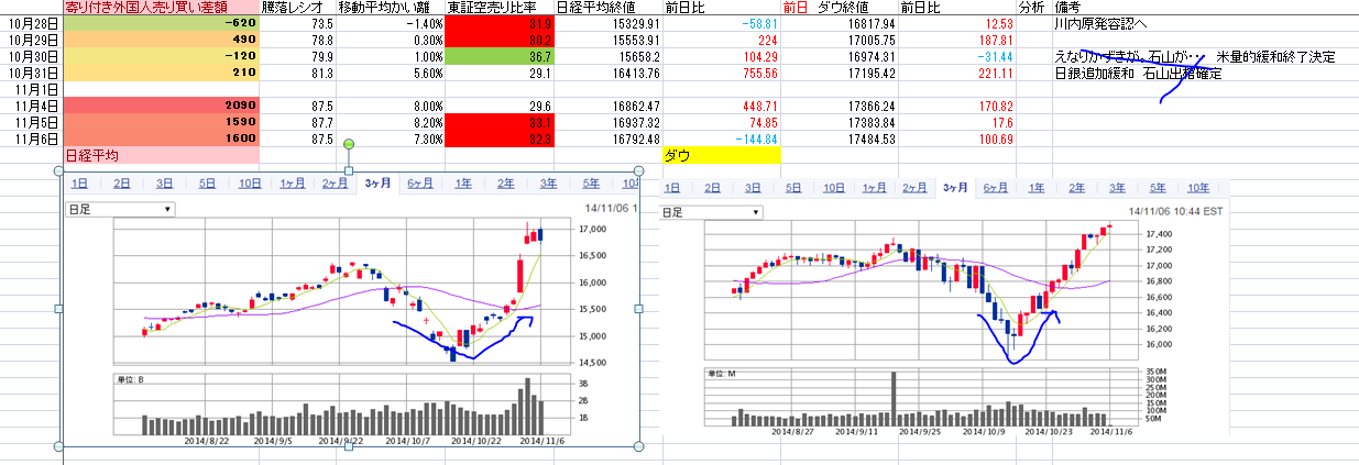 はっきりいってよくわからん相場だ。が、強気は強気なので。目先調整もあるだろうけど、強く押したら買いで行こうかな。まだあの上げに比べたら押しそうだけど、追加緩和相場だからダウ次第では調整も小さくなるかも?