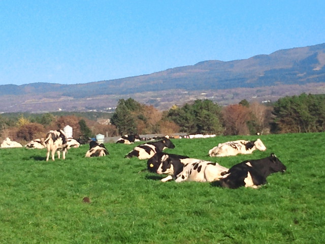今日の富士山、雲がしたにあったり、また牛さんたちがその下で、休んでいる様子がなんとも