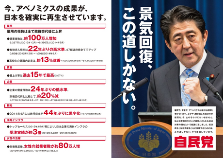 てなわけで、自民党が衆議院選挙用に配布するチラシが決まったみたいですね(b´∀`)ネッ! こちらからPDFファイル形式で見ることができます⇒「今、アベノミクスの成果が、日本を確実に再生させています。」