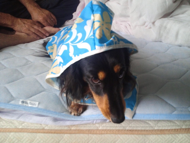 今日からクゥタの腫瘍をちいさくすべく、付属の麻布(電線がうめこまれている)を腫瘍に
