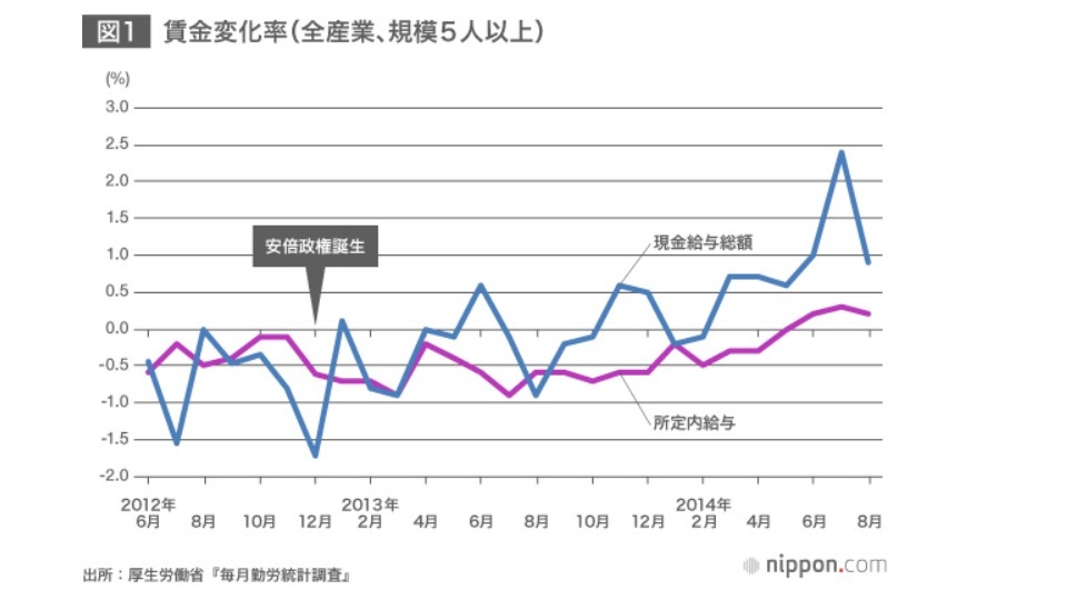 増税分を除く物価上昇率は現在1%程度に対し、現金給与総額の伸びも現在その近辺です。