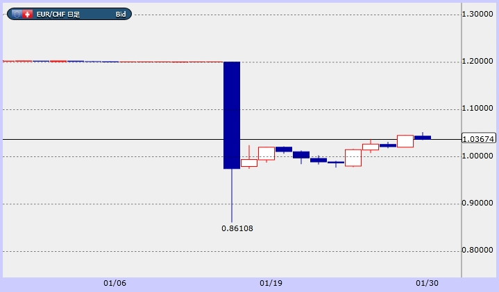 結果としてユーロ・スイスフランでは3,800pipsの大暴落となり、30%を超える大幅な変動となったことから、大損してしまった投資家や一瞬で数億円というお金を手にした投資家が続出しました。