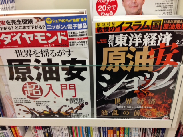 まずは添付の写真をご覧頂きたいのですが、今週の経済誌、「週刊ダイヤモンド」と「週刊東洋経済」の特集が思いっきり被っており、両誌とも「原油安特集」でござりまする。