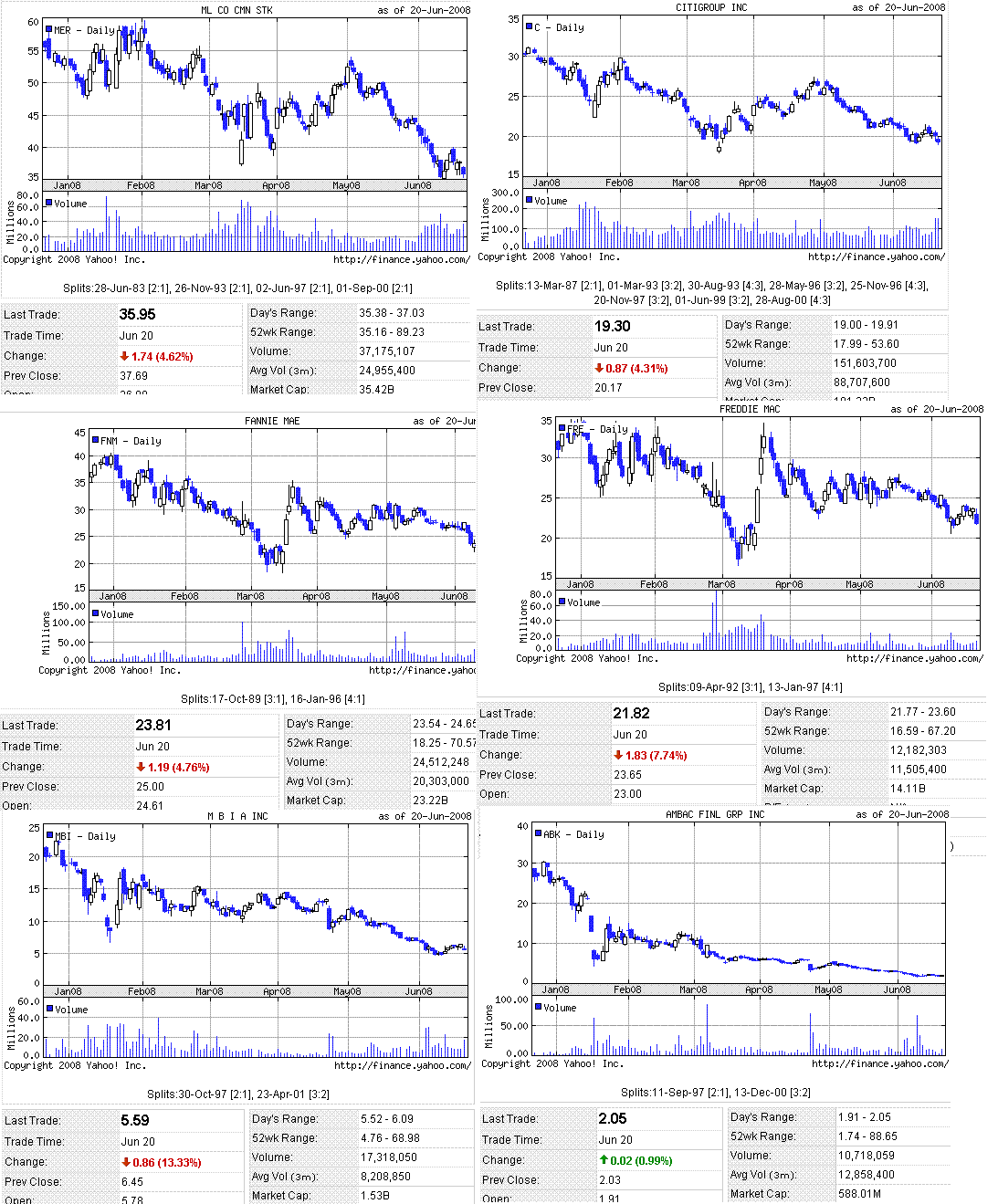 金融株中心に悪材料が続出し、米株は大幅安となりました。具体的には、S&Pがモノライン大手を格下げ、メリルリンチが下方修正するとのうわさ、シティグループの四半期決算が赤字になるとの見方をUBSが示した、ファニーメイとフレディマックがさらなる損失計上をする可能性をリーマンが指摘、ワコビアの目標株価をメリルリンチが引き下げ、GMとフォードをS&Pが格下げの可能性、といったところです。イスラエルがイランの核施設攻撃を想定した大規模攻撃演習を行っていたことから原油価格が反発し、これも株式市場にとってマイナスでした。