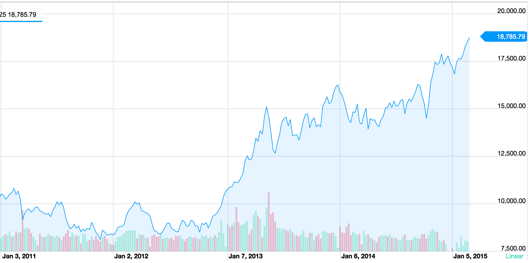 ここ数年の日経平均株価チャート。2年で2倍近くに…。