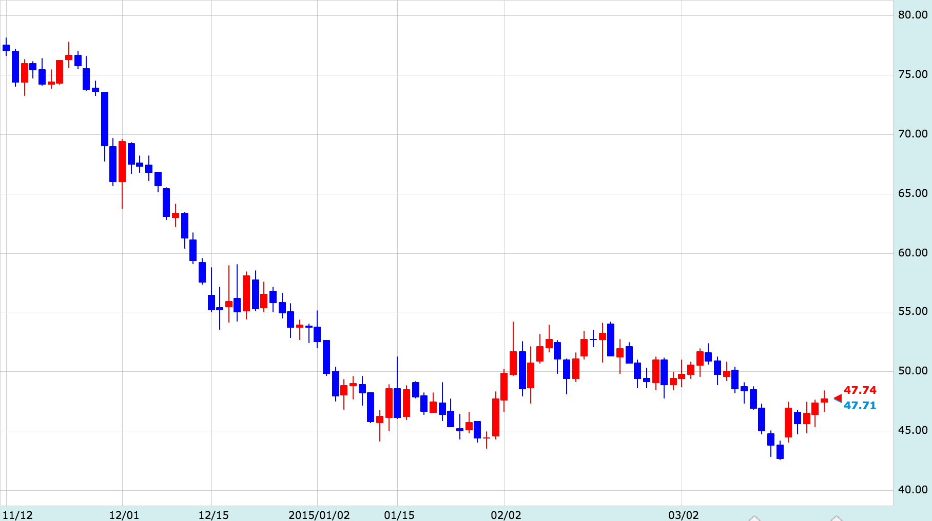 原油価格チャート。最近は下げ止まっているが低空飛行は続く。