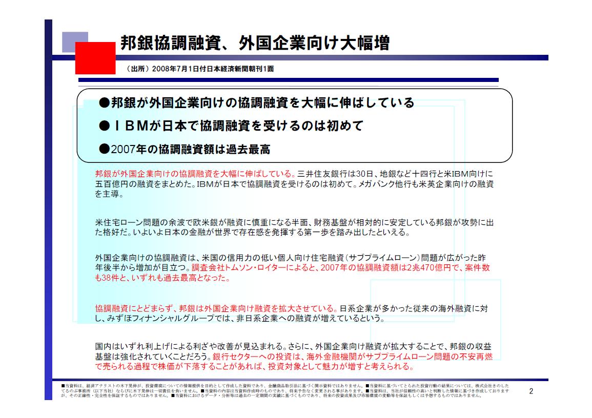 銀行セクターへの投資は、海外金融機関がサブプライムローン問題の
