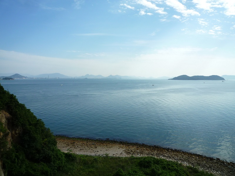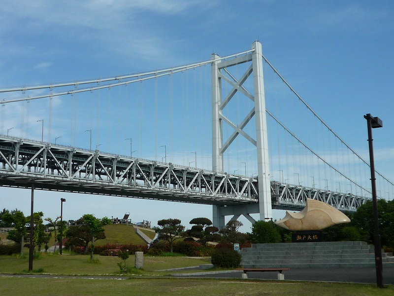 瀬戸大橋はでっかいぞ~   下段をJRマリンライナーが走り上段は自動車道 SAから見た島並みと四国遠景