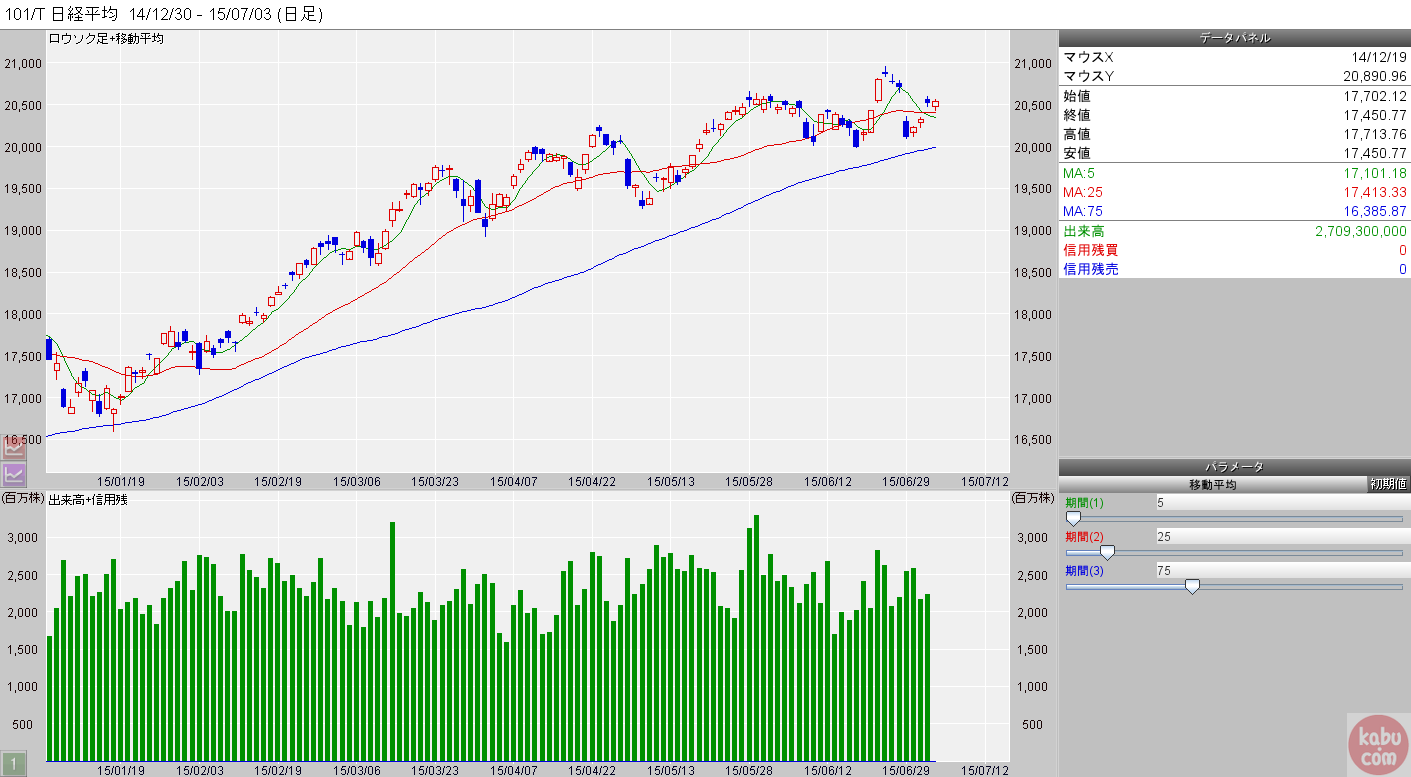 6月後半に入り、日経平均株価は続伸している。ヨーロッパで渦巻いていたギリシャの債務問題への楽観的な見方が広がった影響を受け、2000年のITバブル時を越えて、18年ぶりに終値で2万0863円の高値となった。