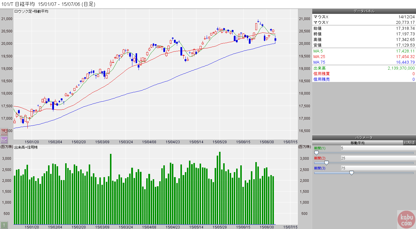 6月後半に入り、日経平均株価は続伸している。ヨーロッパで渦巻いていたギリシャの債務問題への楽観的な見方が広がった影響を受け、2000年のITバブル時を越えて、18年ぶりに終値で2万0863円の高値となった。