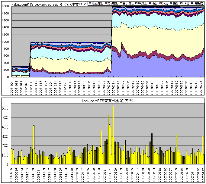 グラフは、夜間取引kabu.comPTSの初日からの売買代金と2006/10/4以降の引けの注文状況の記録です。