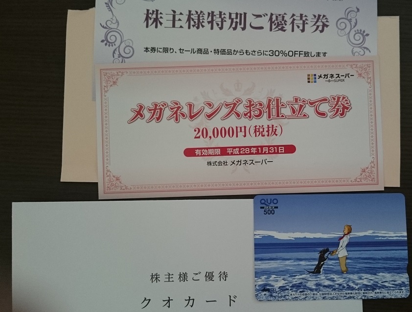 メガネスーパーの優待狙いのフレンズさん多いですね。しろちん殿もNEYFどのも優待が届いて喜んでいたしね。しかしクオカードはいいけどクーポン券ははたしてお得なんでしょうかねェ??先ほどネットで優待のクーポン券を利用した実例の紹介を見て来たんですが眼鏡市場で買った方が安くねェ??と思ってしまいました。ま。実際は分かりまへ~んですけどね。