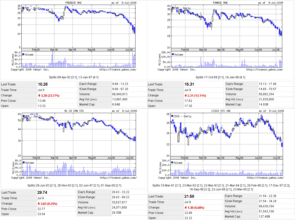 フィッチがメリルリンチを格下げする可能性と発表したこと、ファニーメイが9日に発行した2年債のスプレッドが過去最大のスプレッド(74bps)になったこと、クレディスイスがアメリカの地銀大手50行のうち最大で40%が今後数四半期に減配か増資をする見通しと発表したこと、シスコシステムズが大幅下落したこと、などが嫌気され金融株中心に大きく売られました。原油価格は前日とほぼ変わらず。長期金利は小幅下落。