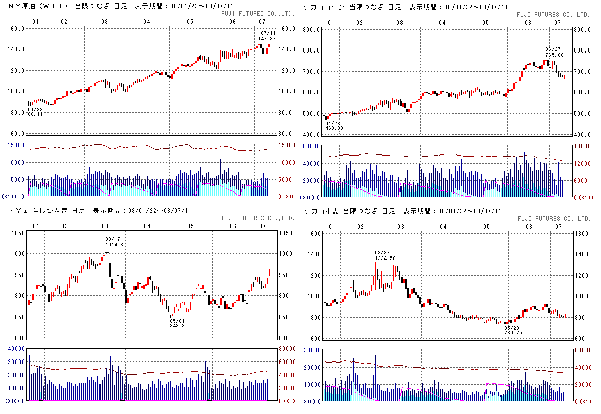 週間では、ダウは-1.7%、ナスダック指数は-0.3%、S&P500は-1.7%の下落率でした。今週は、ダウに続いてS&P500も高値からの下落率が20%を超えベアマーケット入りしました。ダウ、S&P500、FTSE、DAXともに3月安値を下回り、年初来安値を更新しています。今週の株式相場は、政府系住宅金融機関であるファニーメイとフレディマックの資本に対する懸念に振り回されました。また、金融機関の追加損失への懸念が燻り続け、金融株も下落基調でした。バーナンキFRB議長とポールソン米財務長官が、潰れるべき金融機関は他に被害が広がらないようにして秩序だって潰した方が良いといった内容の発言をしたことから、体力的に厳しいと思われるリーマン、メリルリンチ、ワコビアといったところが大きく下落しました。