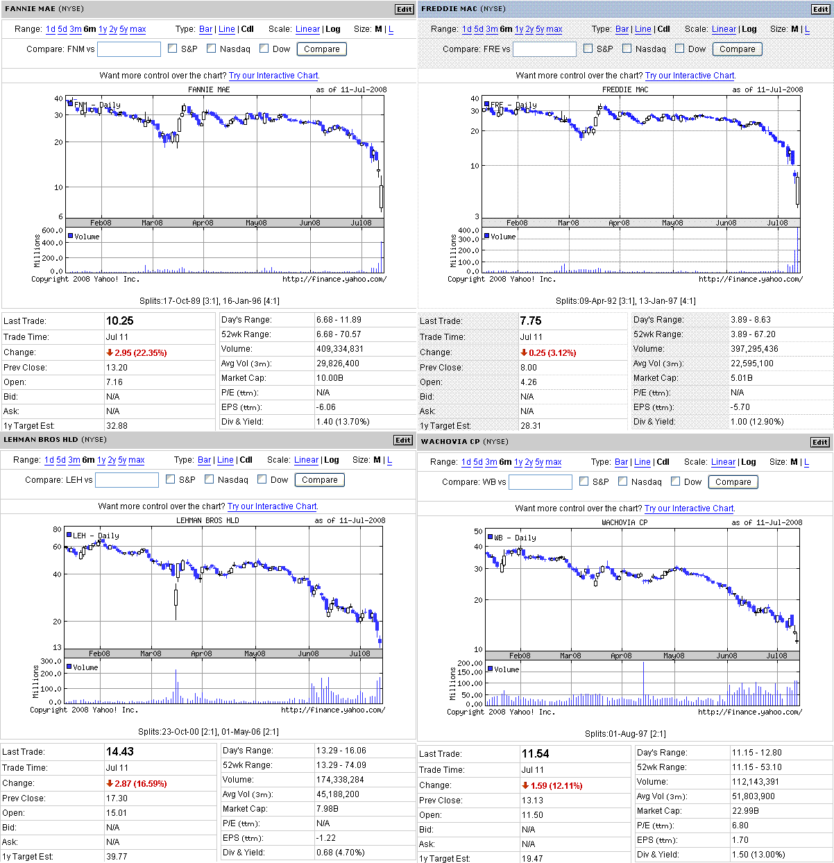 先週金曜の米国市場は、フレディマックとファニーメイが自己資本不足に陥る懸念、またこれらのGSEが国有化された場合に、株券が紙屑同然になってしまう懸念から、フレディマックとファニーメイの株は大幅下落して始まり、全体相場も金融株中心に売られました。ダウの下げ幅は一時-250ドル程度までいきましたが、フレディマックとファニーメイにFedが公定歩合で直接融資するのではないかという見方が広がり、引けにかけてある程度戻して引けました。