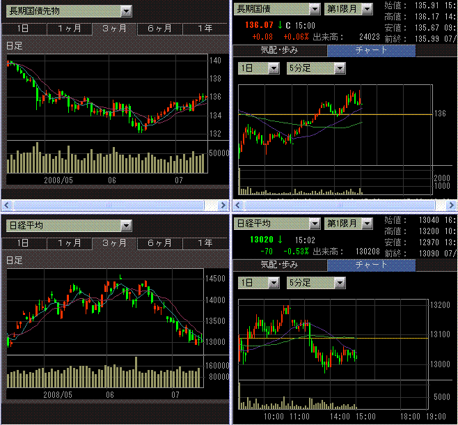 朝方に、フレディマックとファニーメイへの支援策が発表されたことからGLOBEX米株価先物が大幅高し、日経平均もCMEの終値よりも高くはじまりました。前場引けにかけて上げ幅を拡大し、13200円に迫る場面もありましたが、GLOBEX米株価先物の動きがふらふらしてたことやアジア株が下がってきたことから、日経平均も前日比マイナスへの沈んでいき、結局小幅安で引けました。業種別では鉄鋼株が強かったです。