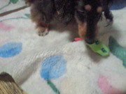 クゥタの腫瘍は大きい、そこに、レヨサンの22.5をつけると、かゆいのか、あるいは注射したところがかゆいのか、、このこのごろ、じゅーたんで、すりすりと、