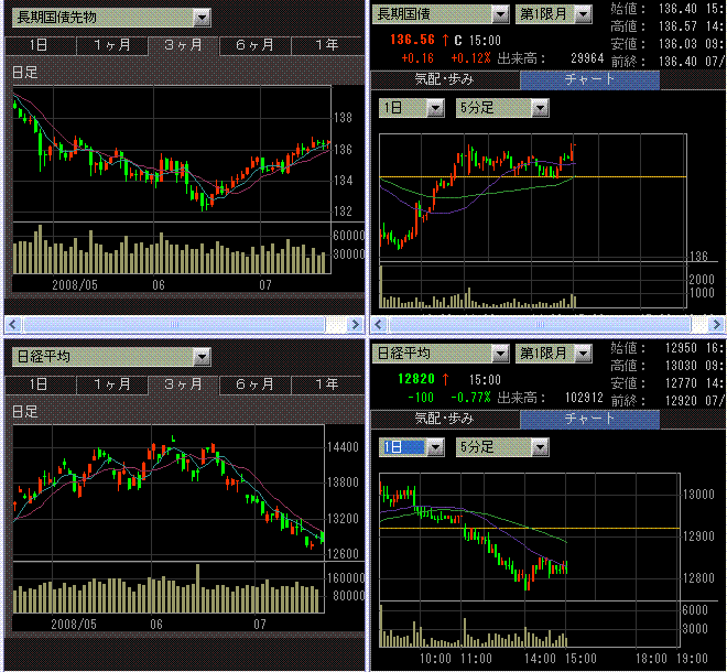 引け後に、メリルリンチがひどい決算を発表し、グーグルとマイクロソフトの決算も冴えなかったことから、GLOBEX米株価指数先物が売られました(日本時間朝方で、ダウ-100ドル、ナスダック-15ポイント相当だったと思います)