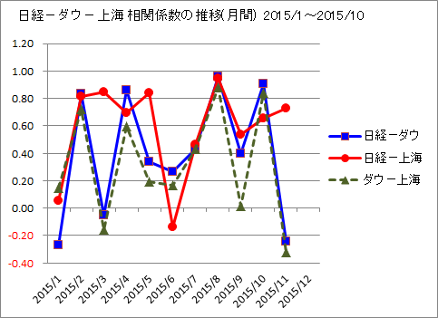 次は日経平均ー上海(総合指数)の月別の相関