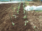 そら豆は弦が伸びるので支柱で倒れるのを保護しています