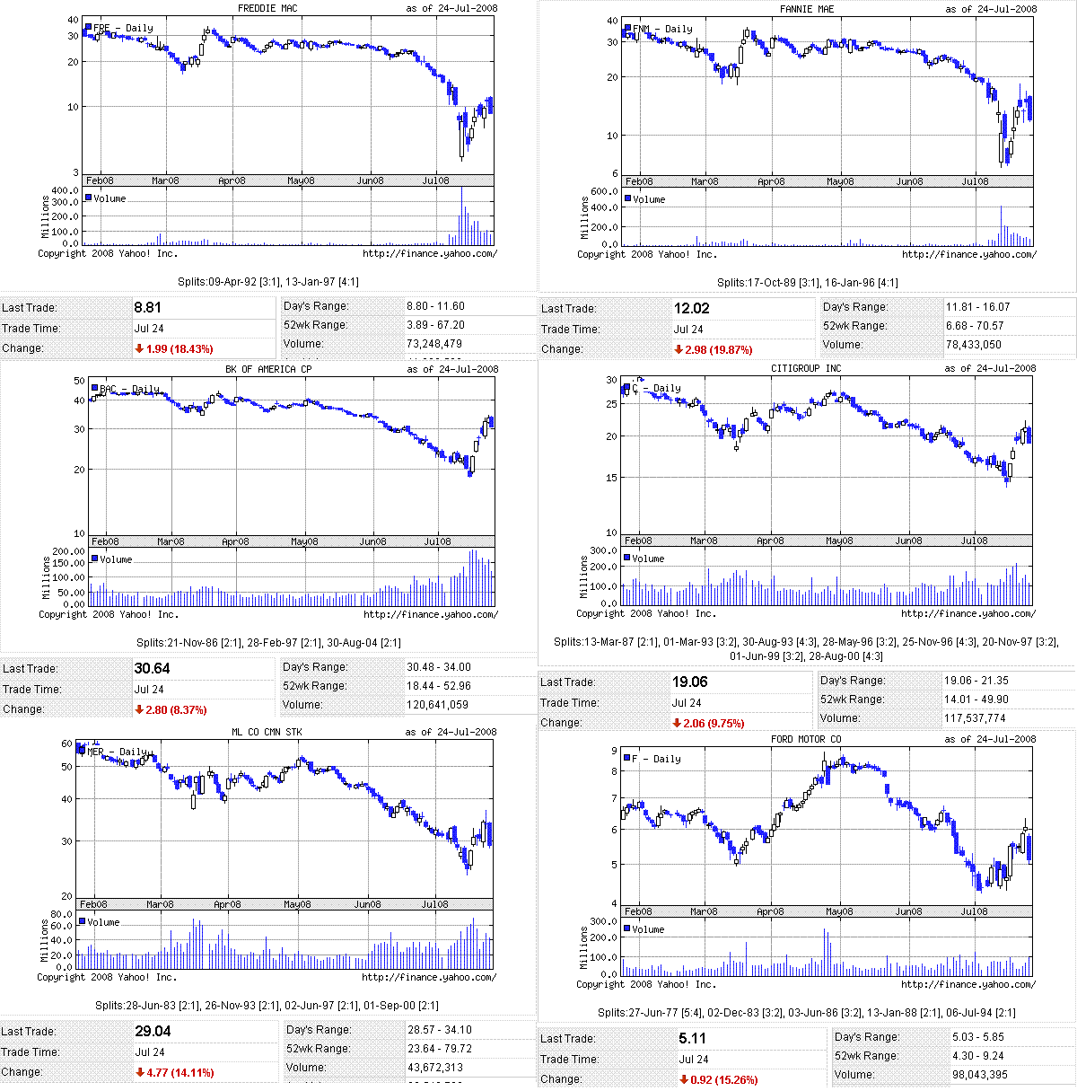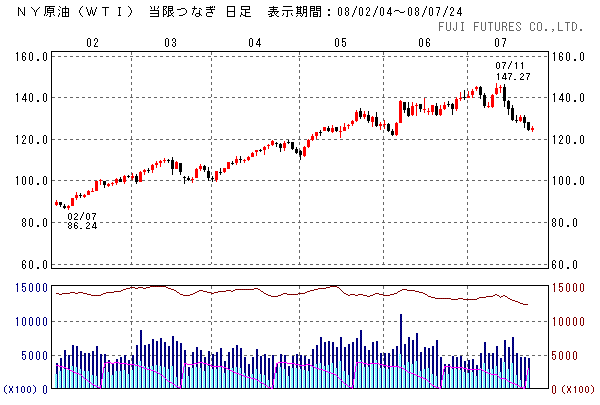 6月中古住宅販売が販売件数、価格ともに冴えなかったこと、週間の新規失業保険申請件数が大きく増加し40万件を超えたこと、PIMCOのビル・グロス氏が、金融機関の評価損は1兆ドルになるだろうと述べたこと、フォードの決算が冴えなかったことなどを嫌気して、米株価指数は大幅安となりました。特に金融株は10%以上下げる銘柄も目立ちました。SECの空売り規制をきっかけとしたショートカバーが一巡して、実体の悪さに再度焦点がいったのでしょう。原油価格は小幅上昇。長期金利は下落。現在の住宅ローン金利、30年固定で6.4%くらいですね。この水準ですと、なかなか住宅市場が回復しないのではないかと思います。