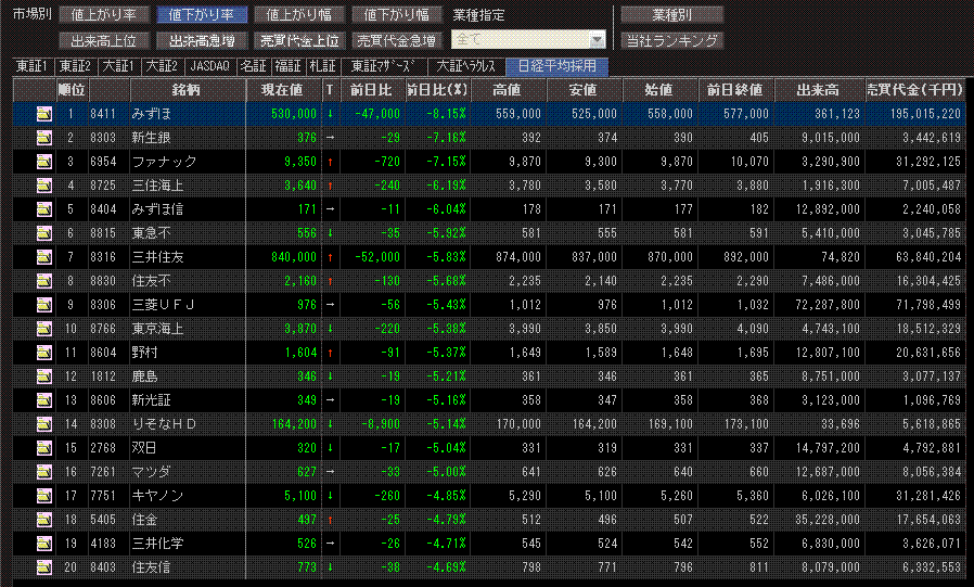 米株安と円安進行を受けて大幅反落。米金融株が売られたため、日本でもメガバンク、証券、保険などの下げが大きかったです。昨日で戻りいっぱいだったのか、単なる押し目か。ファンダは悪いけど、需給は良さそう・・・どっちにいくかな。