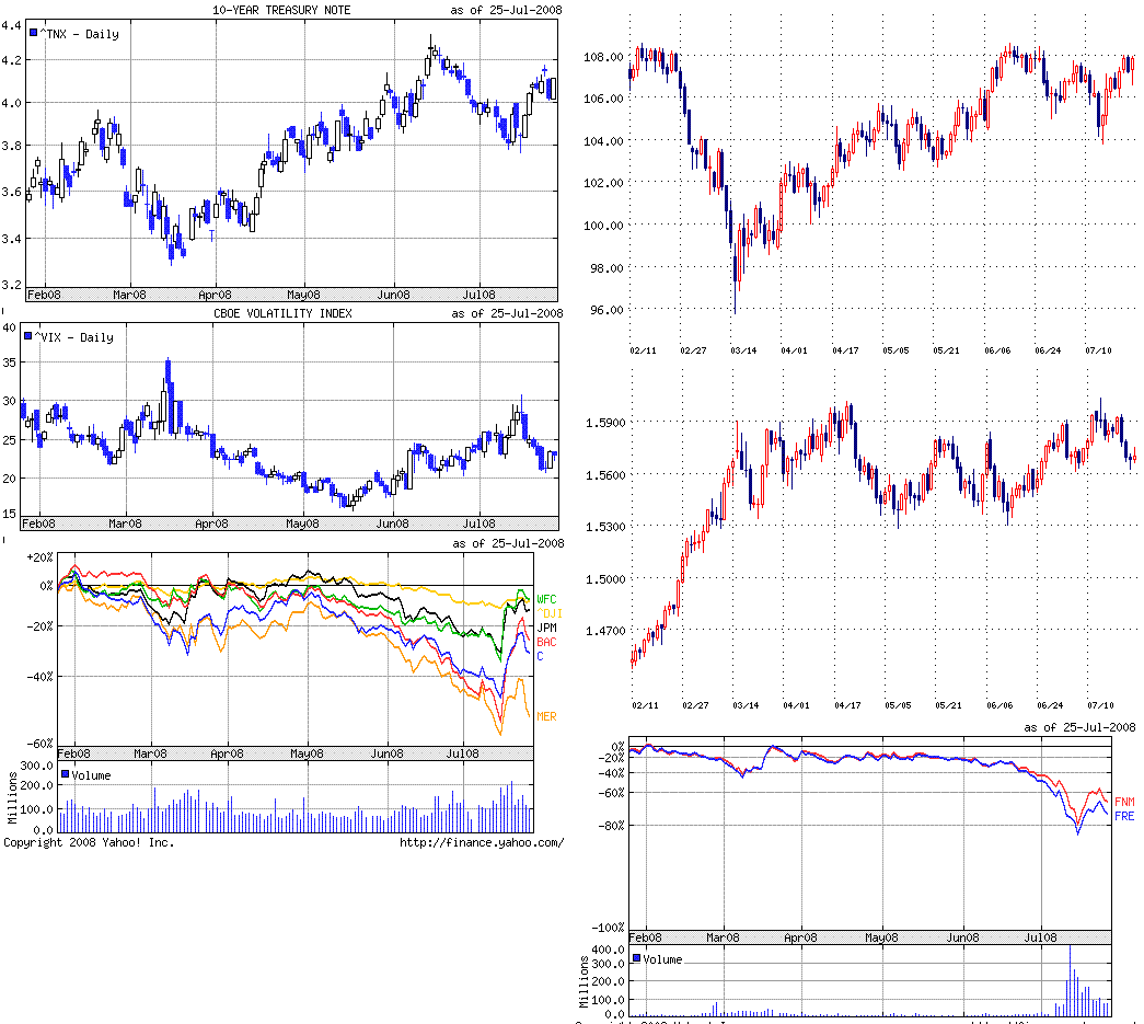 住宅関連の法案は、下院、上院で可決され、週明けにもブッシュ大統領が署名し成立するようです。法案の内容は、ファニーメイ、フレディマックの財務がまずくなった時に、財務省が株式取得を行い出資をすることが可能(公的資金の注入)、ファニーメイ、フレディマック向けの融資枠を拡大、返済が行き詰った住宅ローンを対象に米連邦住宅管理局が最大3000億ドルの借り換え支援、初めて住宅を購入する人に対し最大7500ドルの税控除、などです。住宅市場を反転させるカンフル剤というよりも、急激に悪化することを防ぐためのショックアブソーバーといった内容のようです。