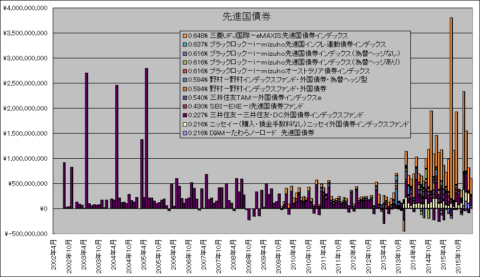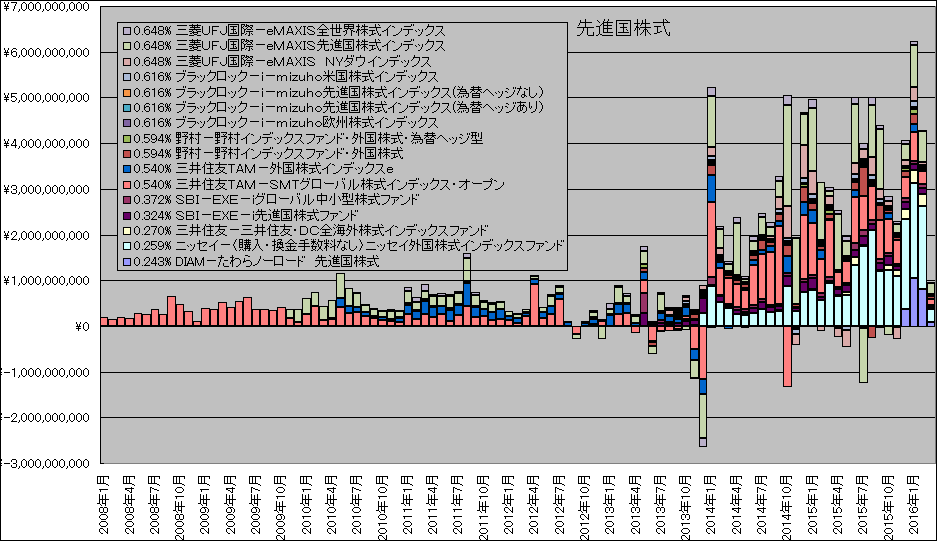 インデックスファンドの月毎の資金流出入額を、まとめました。