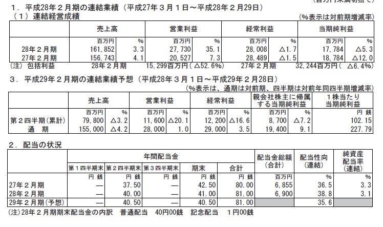 ・平成28年2月期決算、平成29年2月期業績予想、配当の状況は別添えファイルの通り。