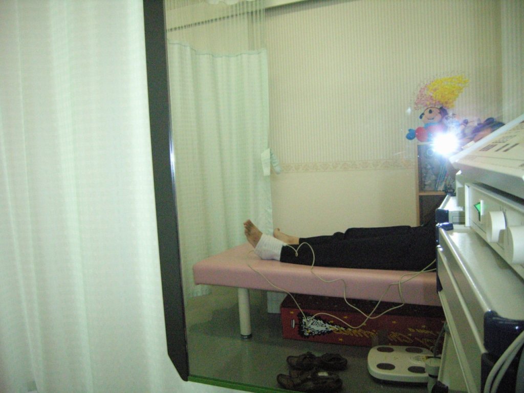 足首の筋肉に電撃を強制的に流して伸縮させ、衰えた筋肉に従来の働きをさせるのが狙いでつ♪ハイ