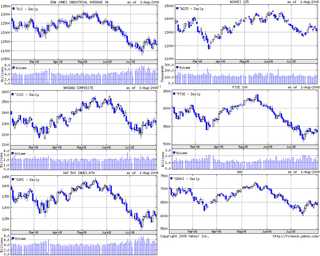 週間では、ダウは-0.39%、ナスダック指数は+0.02%、S&P500は+0.21%でした。週ベースでは前週末終値とあまり変わらない水準となりましたが、日毎ではダウが±200ドルを繰り返す、値動きの荒い展開でした。前週末に2行の地銀が破綻したことから、週初から大幅安。今週末もまた新たに1行が破綻しています(今年8件目)。メリルリンチがサブプラCDOを売却し資金調達を成功させたことから、火曜日は大幅高。ADPの雇用者数が予想外のプラスになったことから水曜日も大幅高。木曜日は、第2四半期GDPの伸び率が予想を下回ったことから大幅安。金曜は、GMの大赤字決算が出るも、雇用統計が予想から大きく外れなかったことから、比較的マイルドな下げ幅で終わりました。