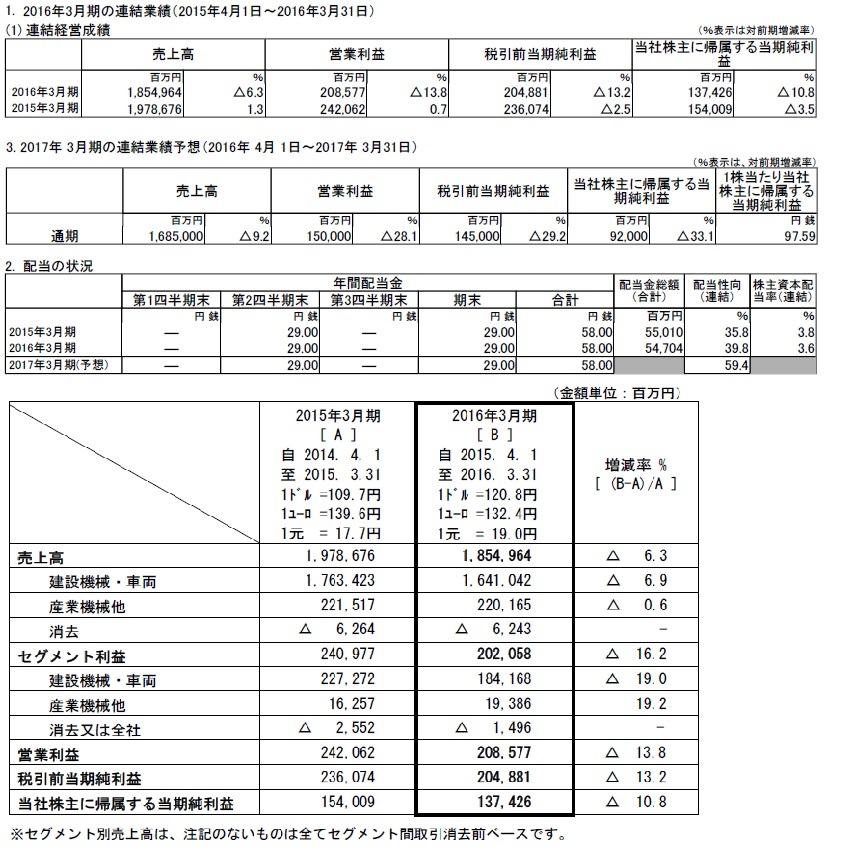 コマツが決算を公表。また新中期経営計画も公表されています。