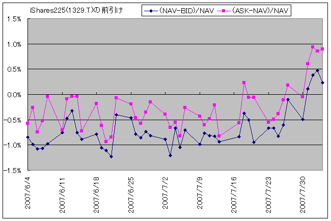 このETFについて前引けの状況を調べていますが、最近ちょっとした変化がありました。グラフにあるように、最近取引価格がNAVを上回るようになっています。分配権利を狙って買っているヒトがいるからでしょうか?