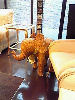先日の結婚式の場所には、ゲストがくつろげるソファーがゆったり置かれたスペースがあったのですが、そこに鼻が上向きの象さんを発見。