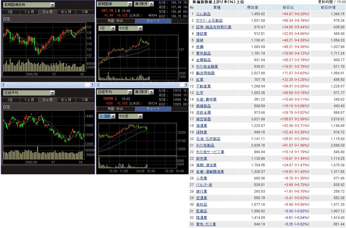 米株高を受けて、日経平均も大幅となりました。原油安からゴムが高かったです。売り込まれていた景気循環株はそれなりに反発しましたが、今までの下げ幅からすると物足りない感じです。商社は原油価格の影響が大きいからしょうがないとしても、機械や海運はもうちょっと戻ってもね・・・と。やはり景気悪化が鮮明になってきたことで、景気循環株は積極的には買われにくいのでしょう。かといって、今の位置から、電力、医薬品、食品などのディフェンシブを掴みにいくのも怖いですね。ロングオンリーでフルインベストのところは大変です。個人投資家で良かった。