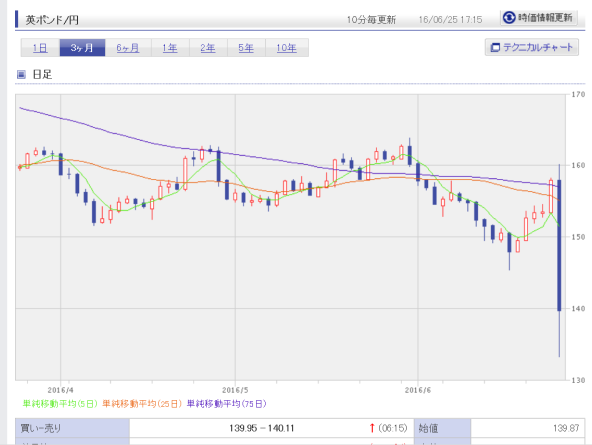 英国はしばらく荒れるでしょうね。スコットランド独立、歴史的にみれば統合と分離を繰り返してきた関係なので、ありかもと思います。また、経済発展を続ける都市部に対する地方の反乱という見方もでていますが、そうだとするとアメリカもトランプありかもという雰囲気になってきます。地元住民が肌で感じている感覚がエリートの良識を破った結果ですから、アメリカでも同じことが起こるかもと思います。明日のヴェリダスになんて書いてあるかが、楽しみです。落ち着いてみれば、対応する時間は十分ある問題なので、月曜日は下げすぎを咎める半分戻しぐらいあるかもしれません。