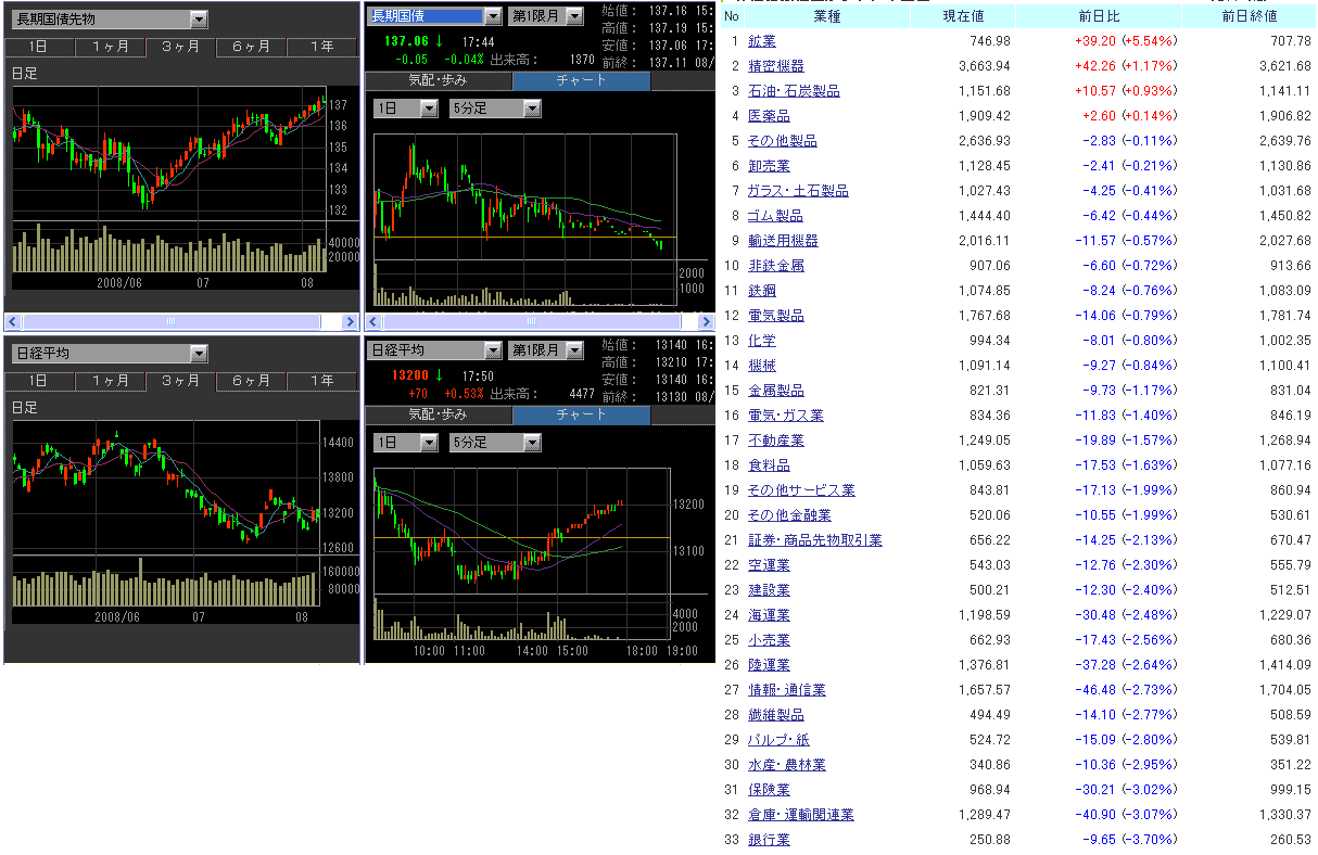 為替について。ドイツの6月製造業受注が予想を大きく下回ったことからユーロが売られ、日本も昨日発表された景気動向指数で内閣府は景気の基調判断を悪化とし景気後退の色が濃くなったことから円が売られ、結果としてドル高になりました。ドルが上がるのは、米経済の悪化が最初に顕在化し、これまでにドルはある程度売られていたためでしょう。ここ数か月のマクロ経済指標の結果は、ユーロ圏も日本もやっぱりダメになっていくのね・・・って感じです。