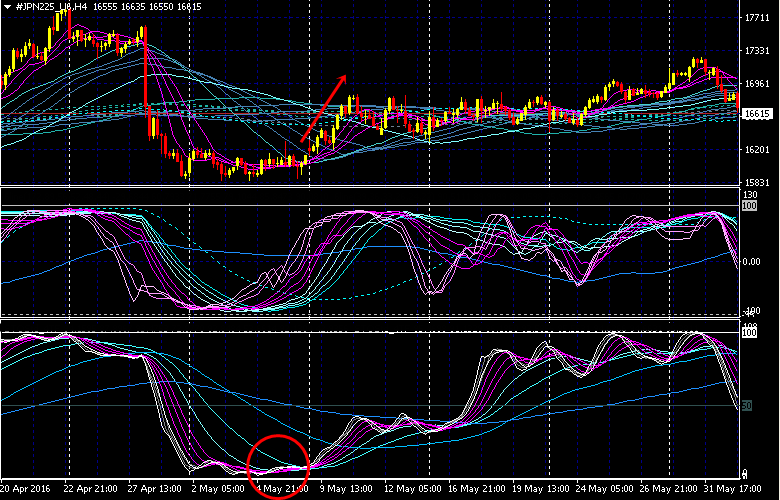 赤丸印の所が、テクニカル指標での上昇の起点です。