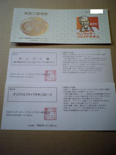 本日(9873)日本ケンタッキー・フライド・チキンの株主優待が到着しました。